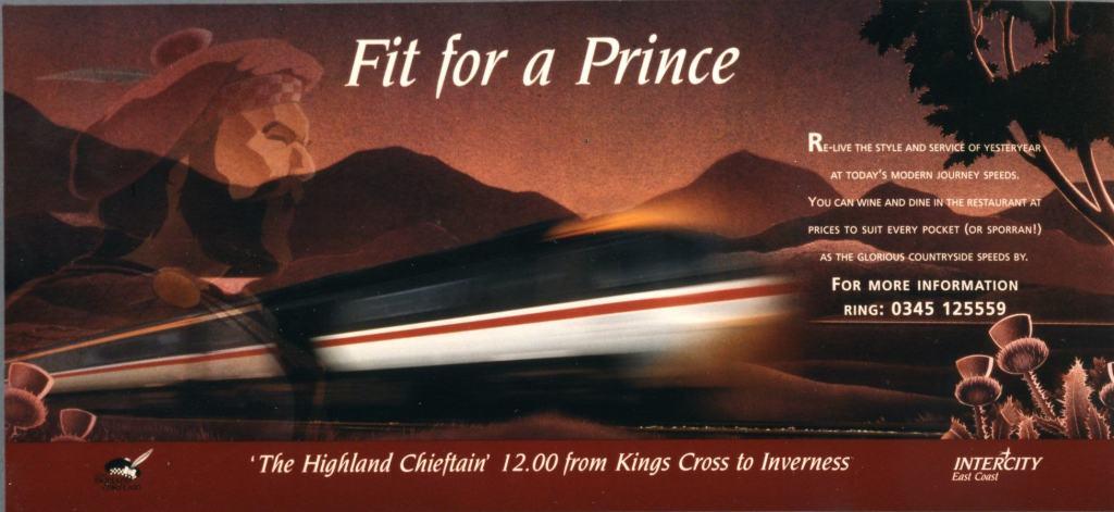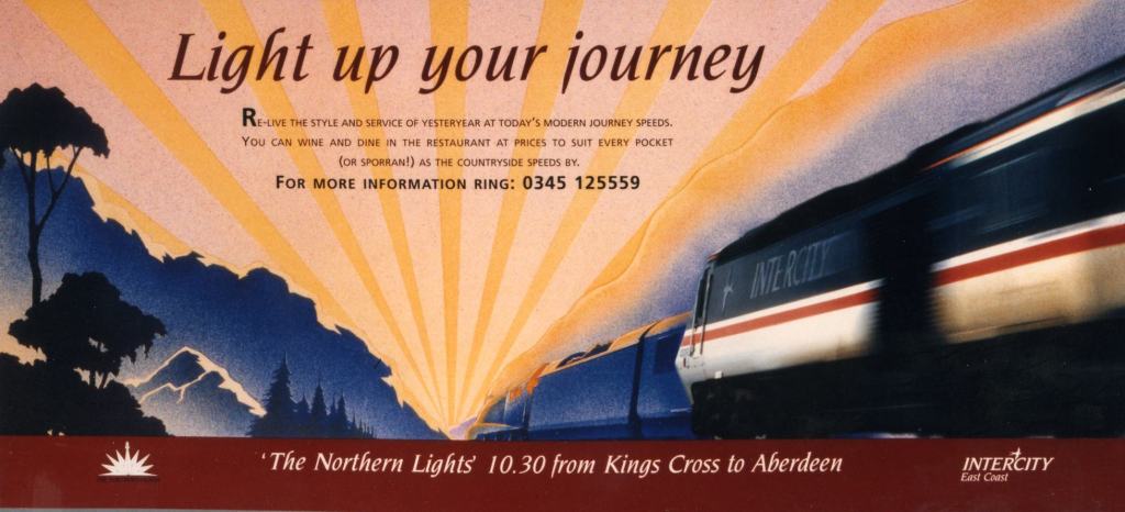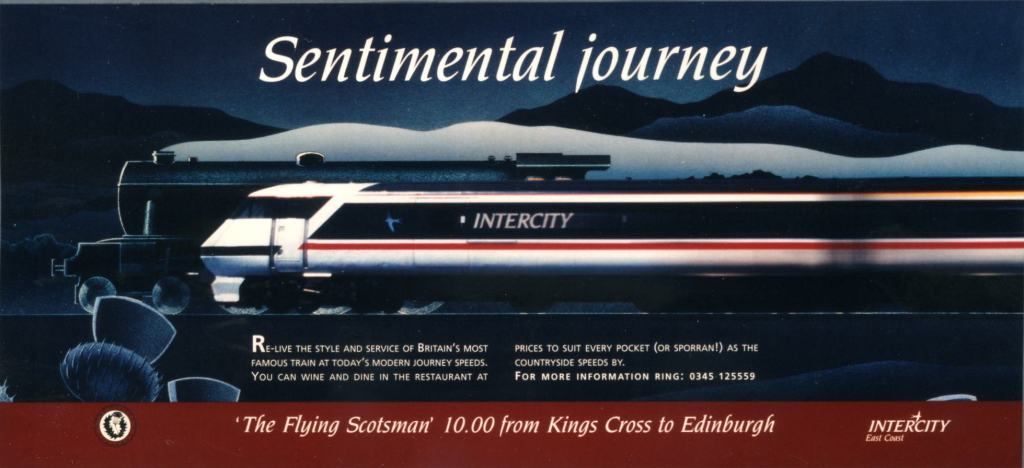 This 1994 set of advertisements cover the long distance trains from London to Scotland. On the left is the press advertisement and below are three outdoor advertisements displayed on hoardings (billboards).